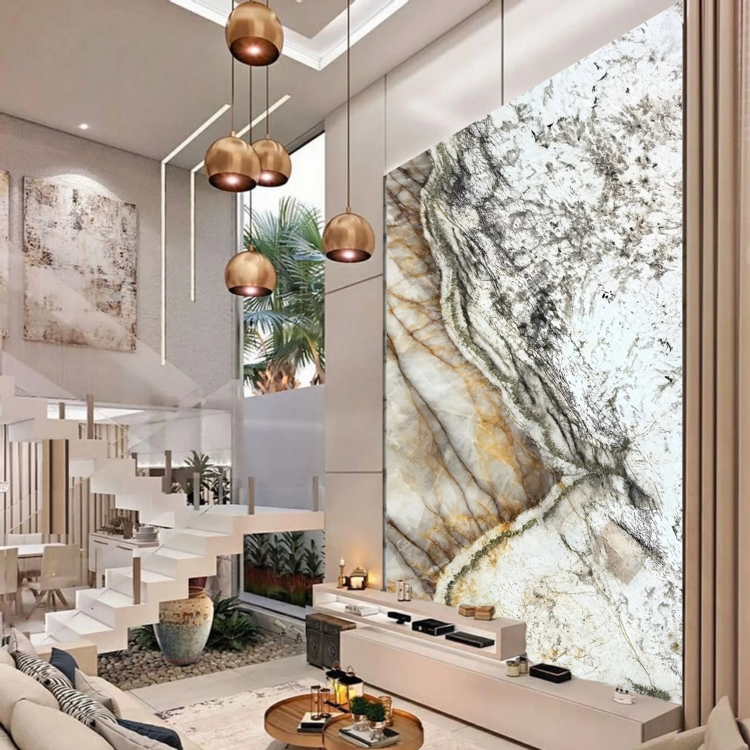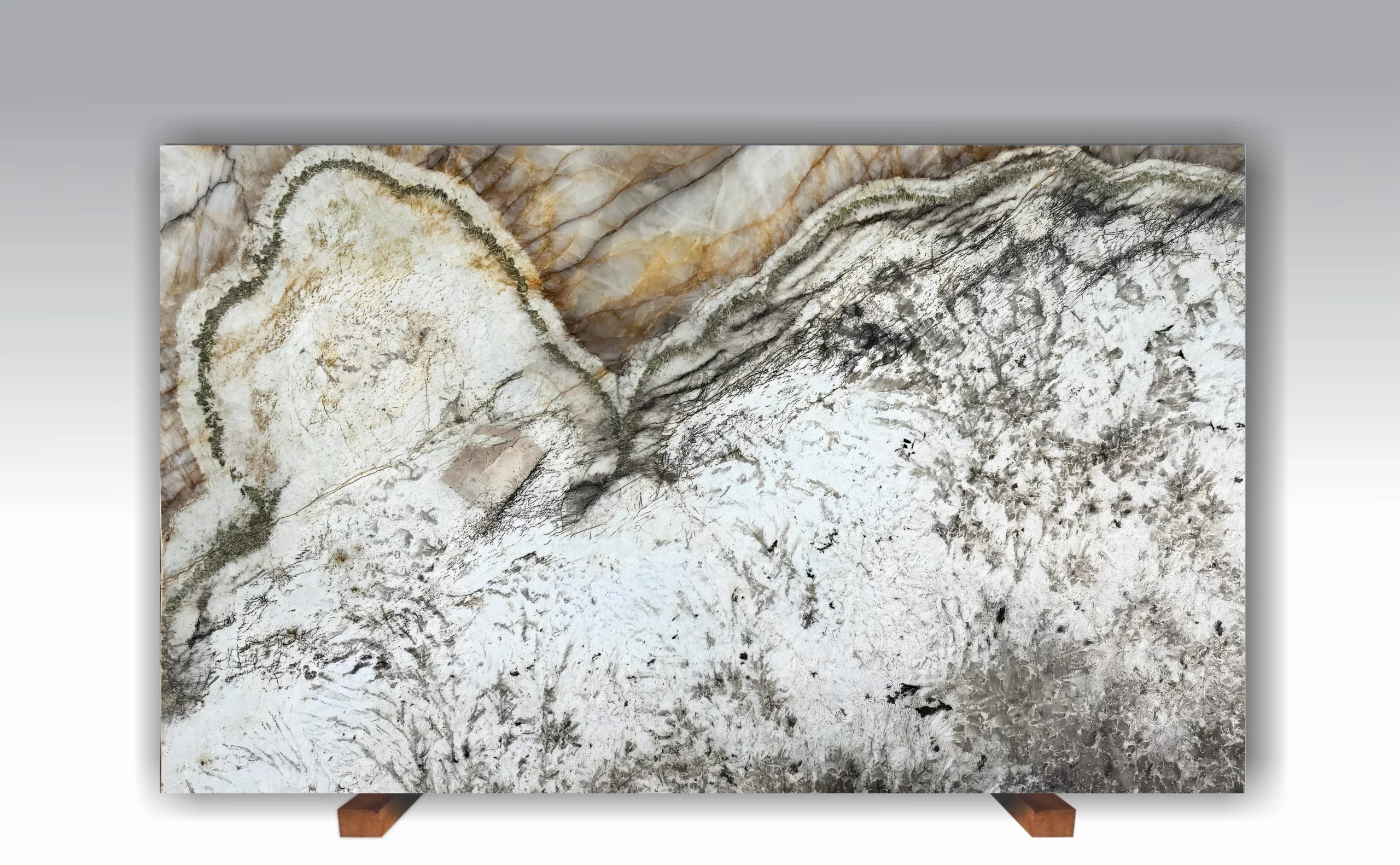 Balance and elegance : The combination of quartz and golden hues creates a stone that is both expressive and harmonious. It enhances an elegant and refined atmosphere, while maintaining a balanced visual appearance.