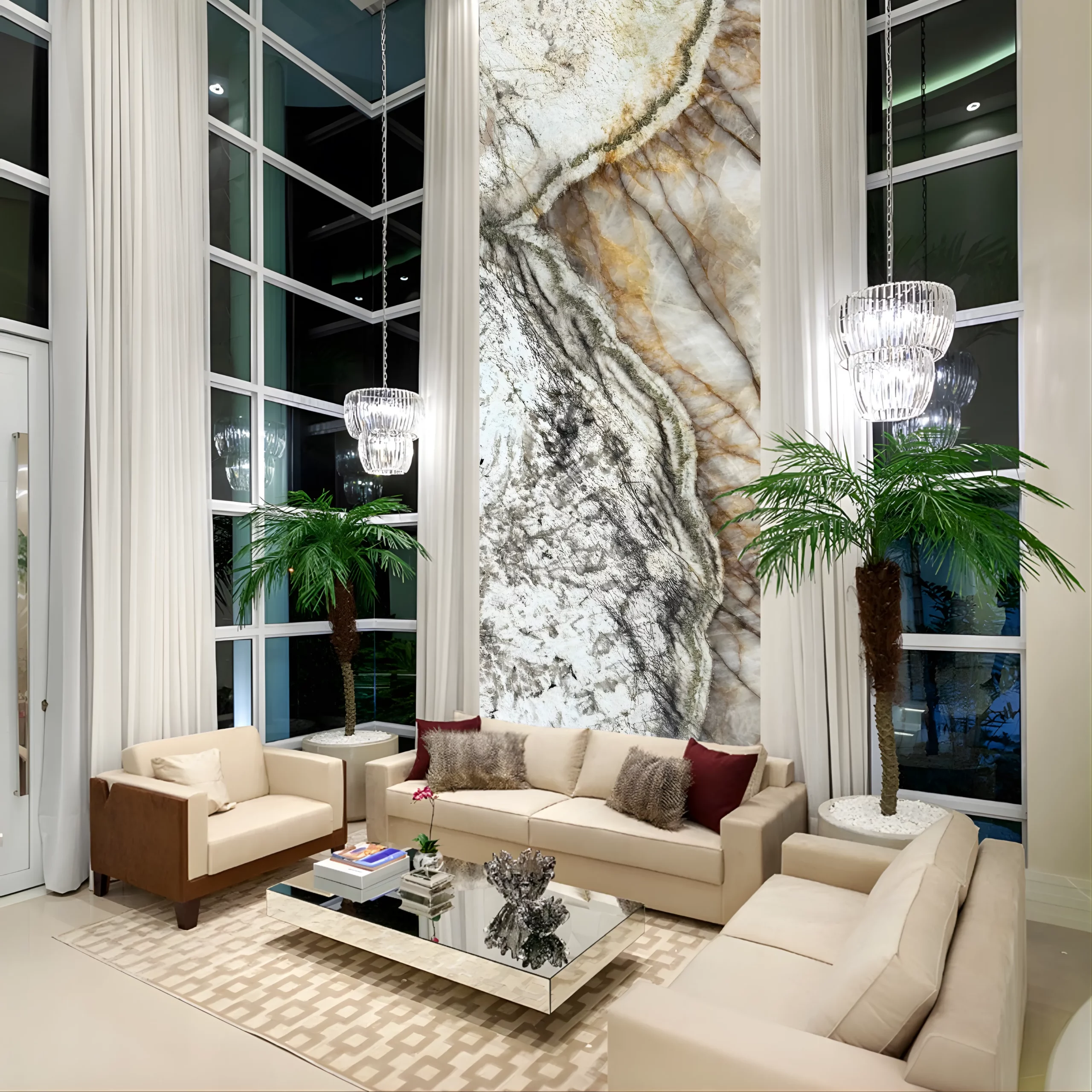 Walls and panels : Used as wall cladding or decorative panels, golden quartz crystal transforms surfaces into bright and warm elements. It fits particularly well in prestigious residential spaces, hotels, restaurants, or reception areas where light plays a central role.