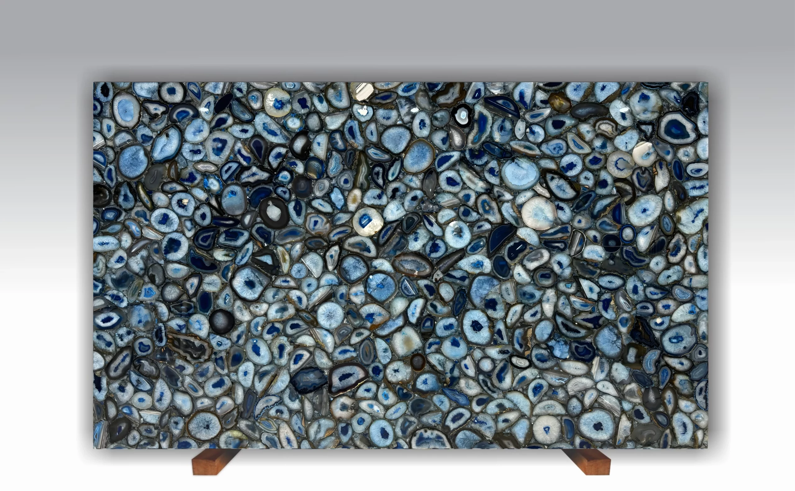 Pose : L’agate bleue est fixée avec des adhésifs adaptés aux pierres naturelles, souvent époxy ou silicone spécial marbrerie, pour garantir la durabilité.