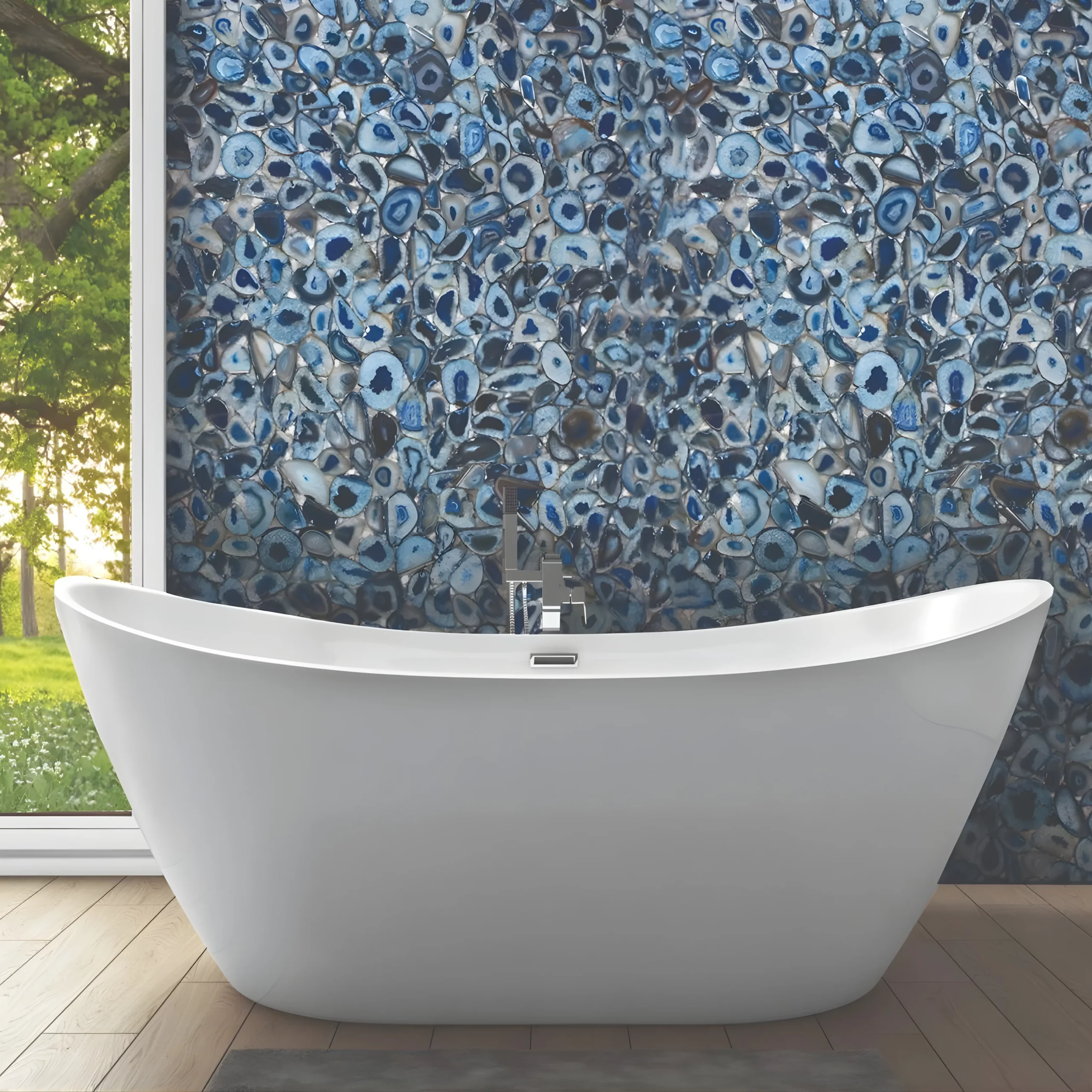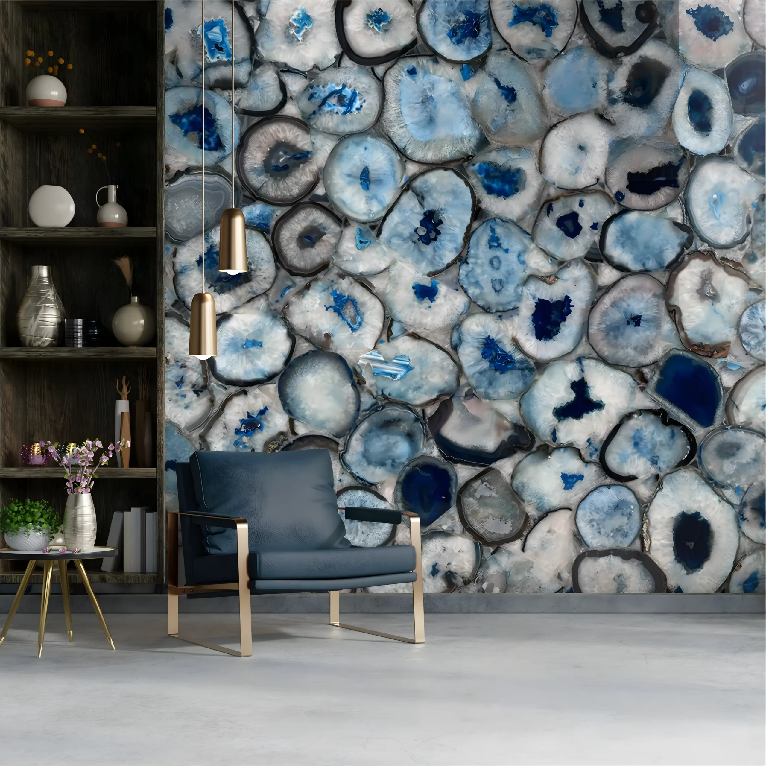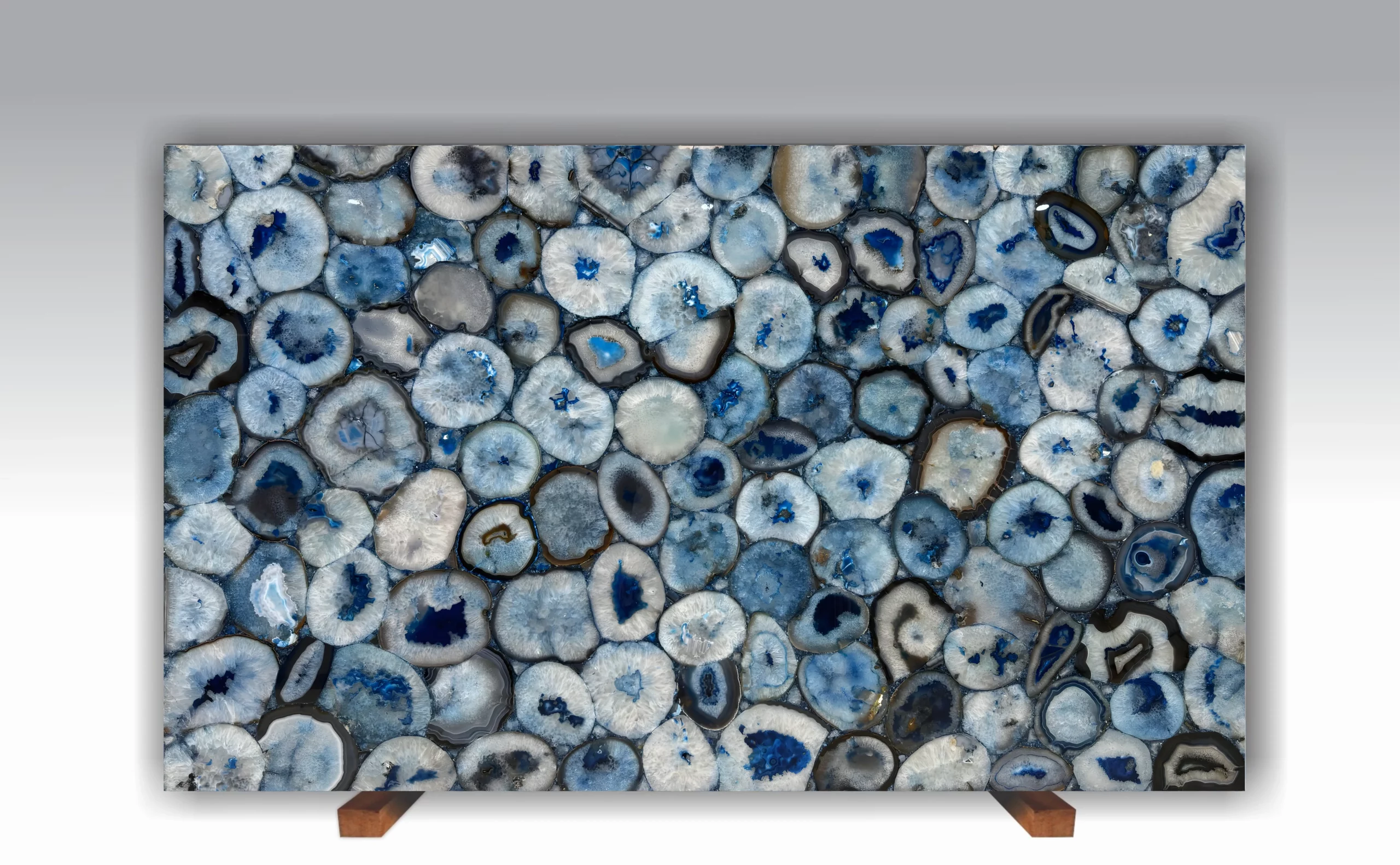 L’agate bleue est souvent utilisée sous forme de plaques polies, ce qui met en valeur ses motifs uniques. Elle est idéale pour des applications décoratives haut de gamme, comme des crédences de cuisine, des dessus de meubles, ou des panneaux muraux rétroéclairés. La translucidité naturelle de certaines plaques d’agate bleue les rend parfaites pour des jeux de lumière spectaculaires.